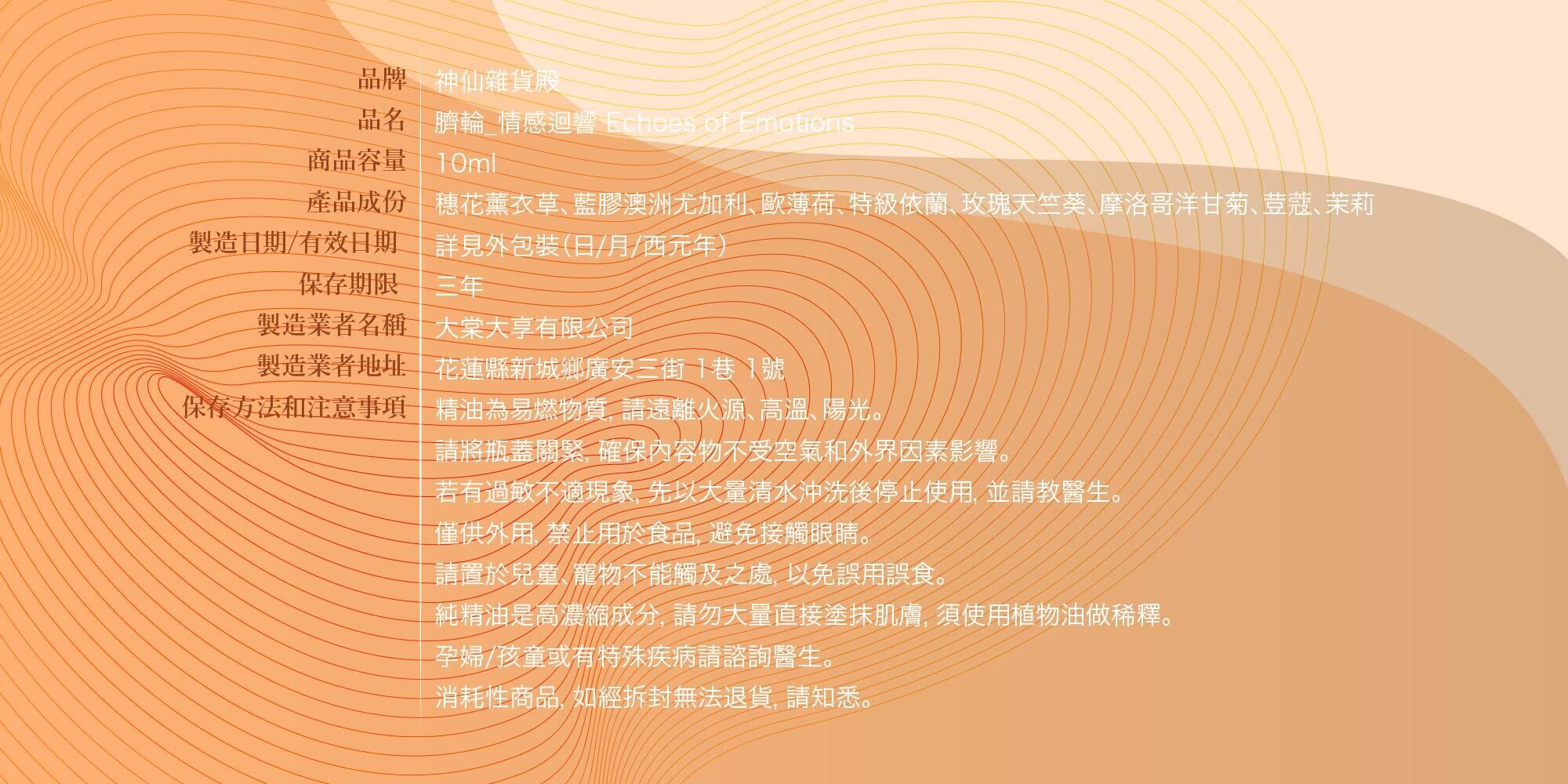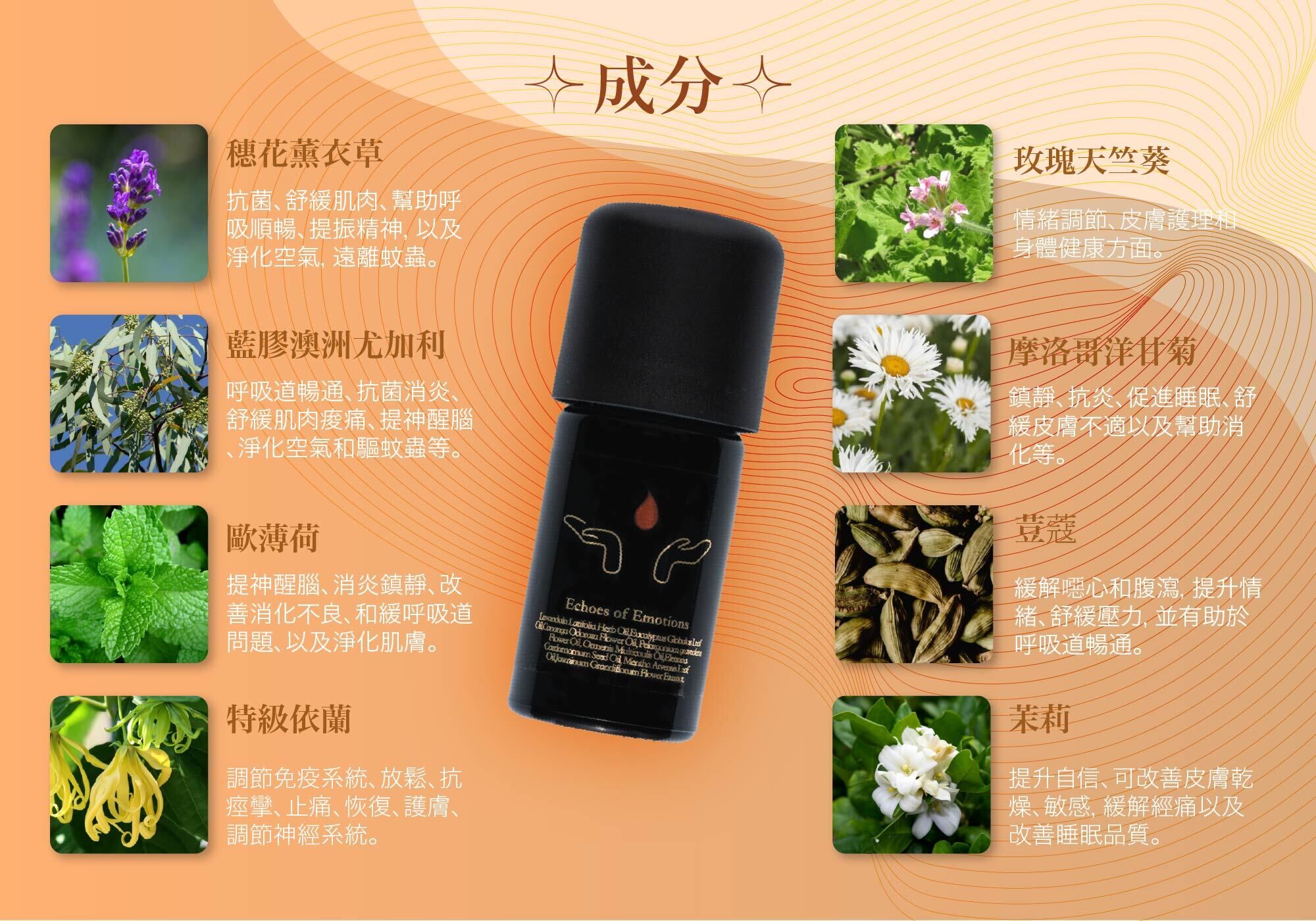 成分: 穗花薰衣草、藍膠澳洲尤加利、歐薄荷、特級依蘭、玫瑰天竺葵、摩洛哥洋甘菊、荳蔻、茉莉