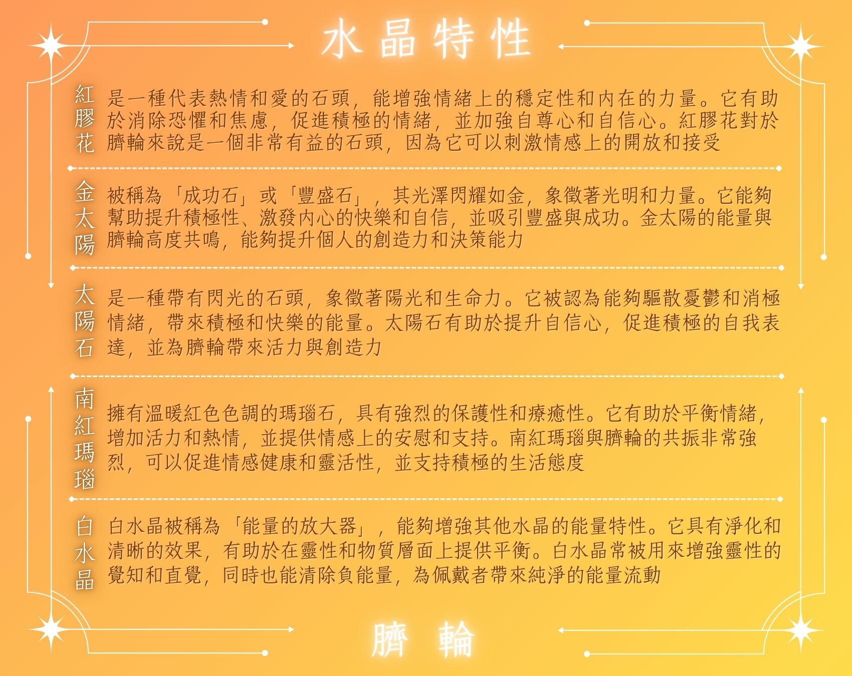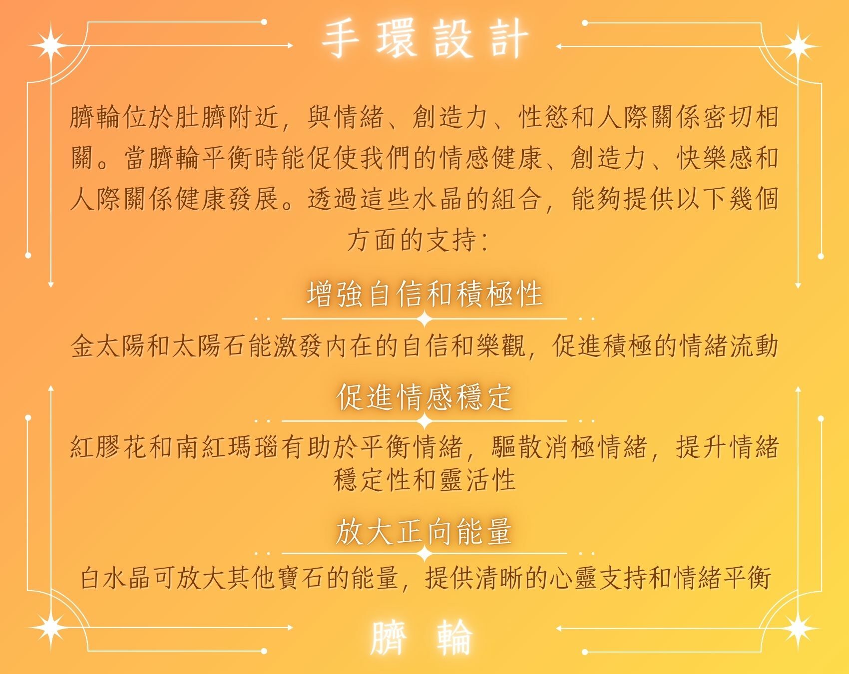 臍輪位於肚臍附近,與情緒、創造力、性慾和人際關係密切相關。當臍輪平衡時能促使我們的情感健康、創造力、快樂感和人際關係健康發展。透過這些水晶的組合,能夠提供以下幾個方面的支持: