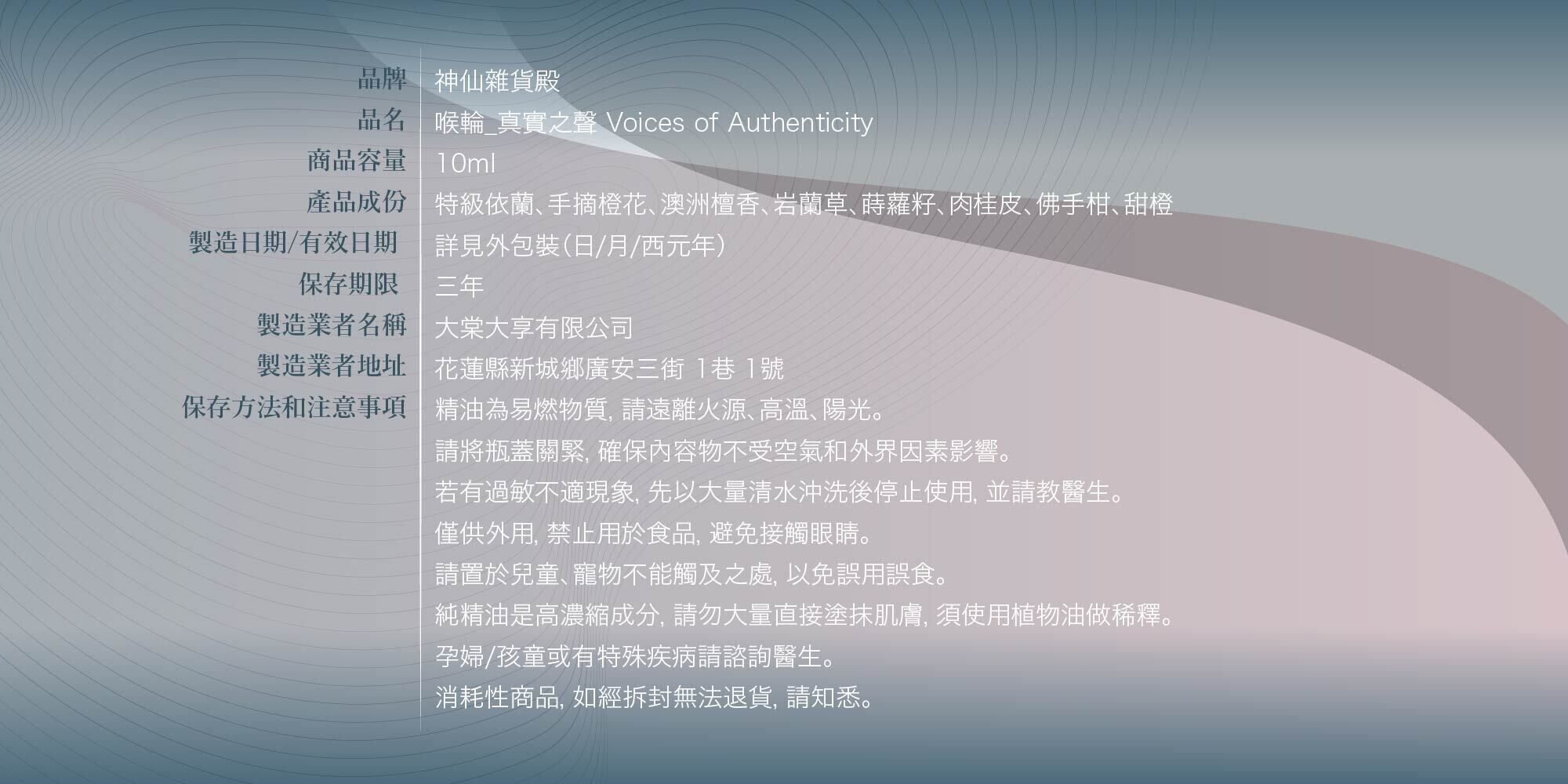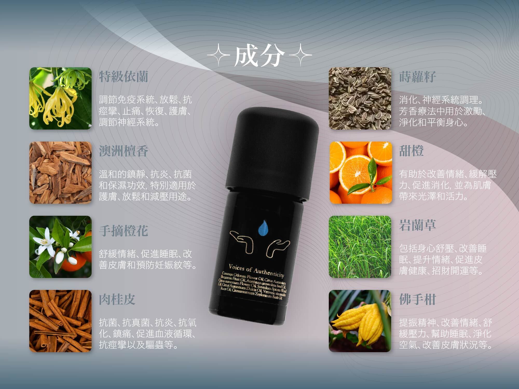 成分: 特級依蘭、手摘橙花、澳洲檀香、岩蘭草、蒔蘿籽、肉桂皮、佛手柑、甜橙
