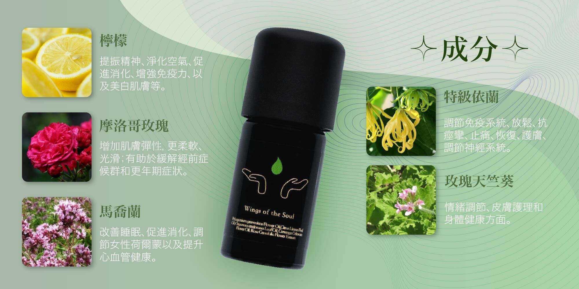 成分: 檸檬、摩洛哥玫瑰、馬喬蘭、特級依蘭、玫瑰天竺葵