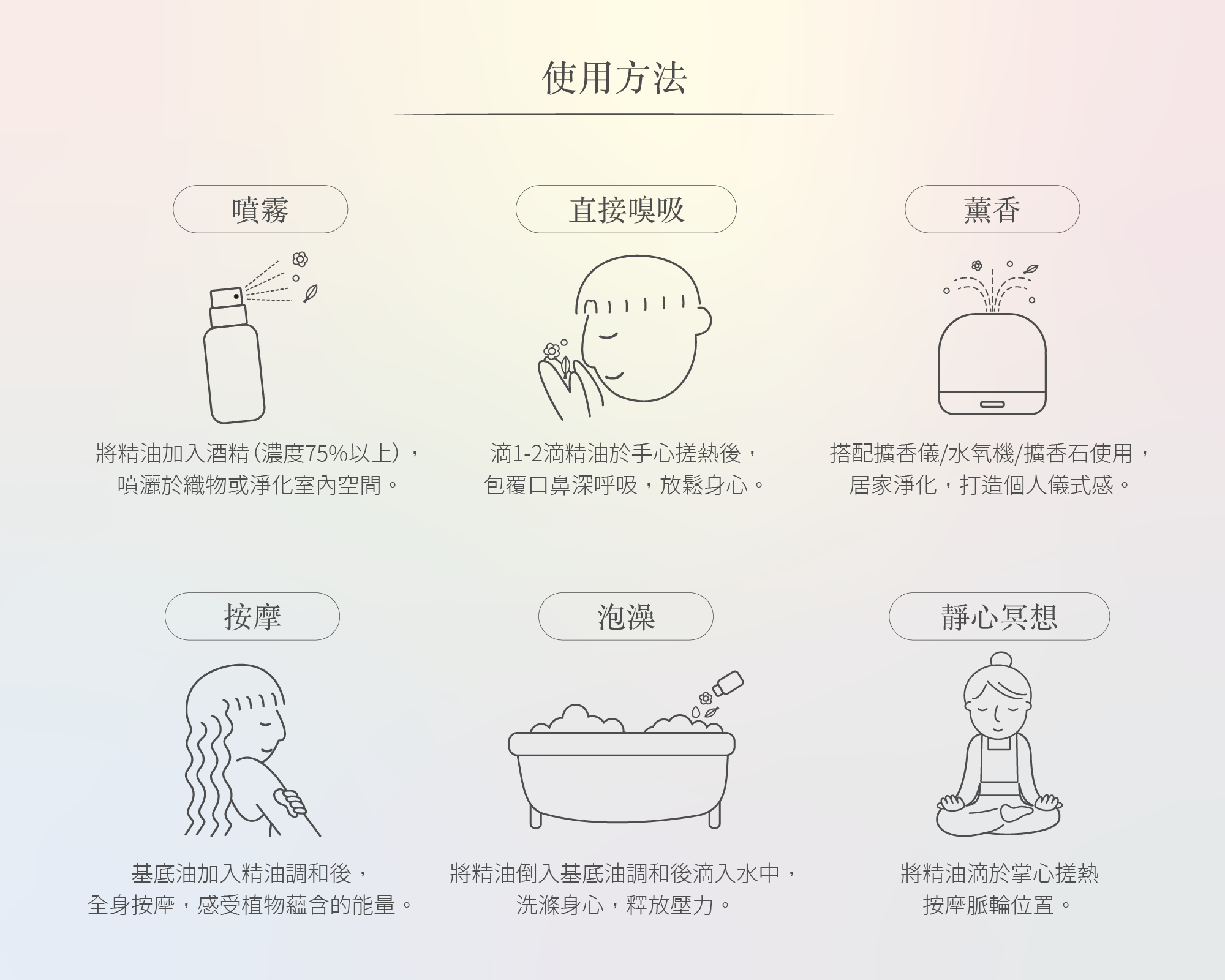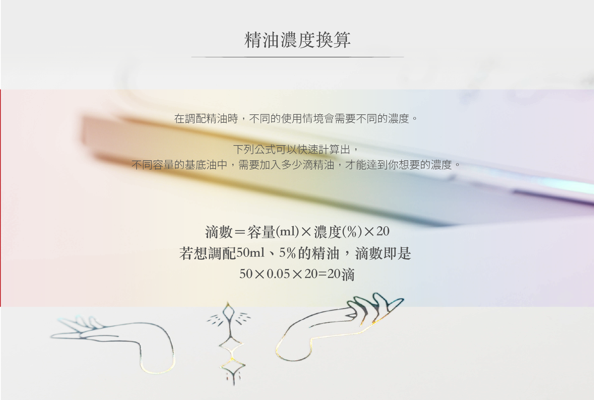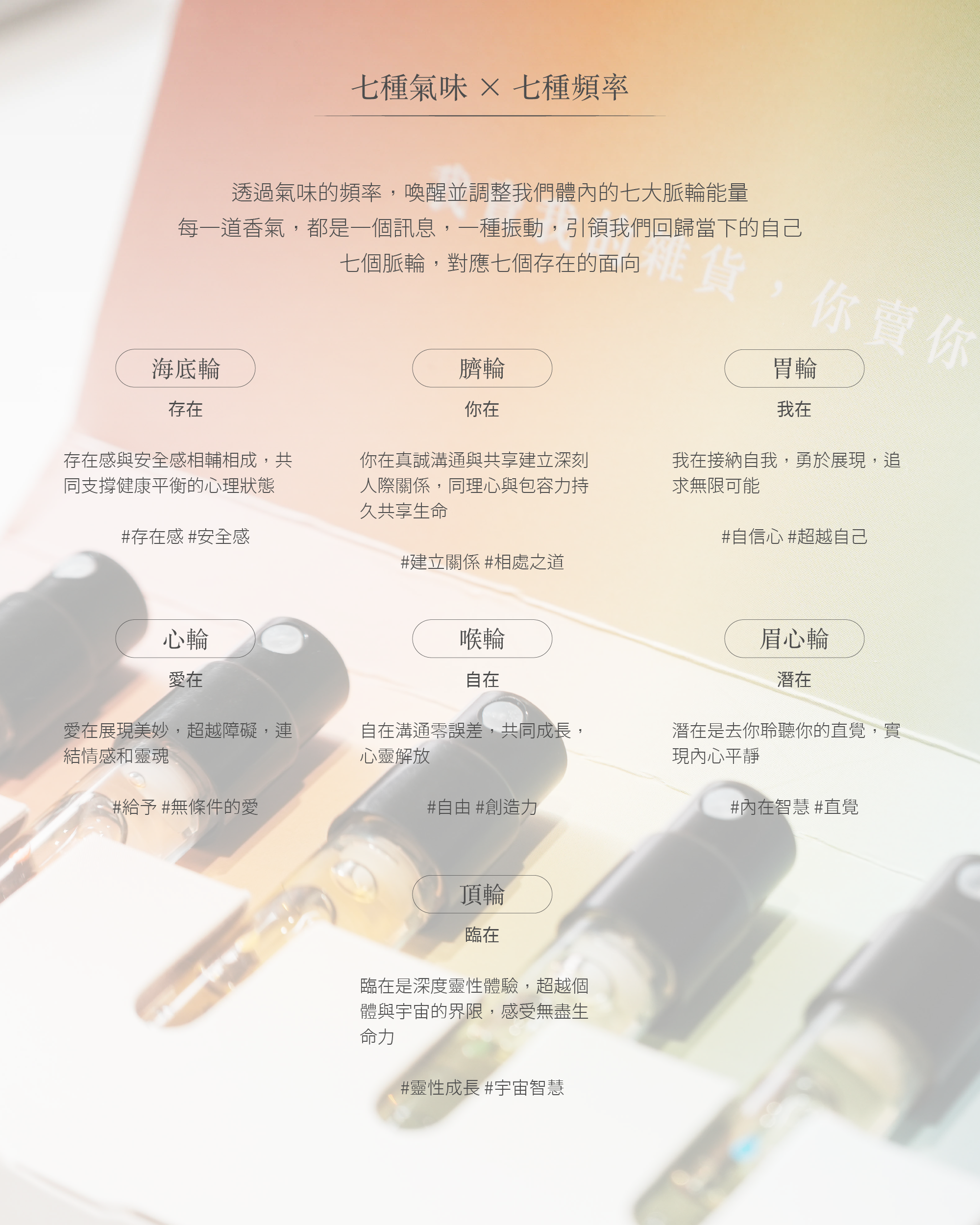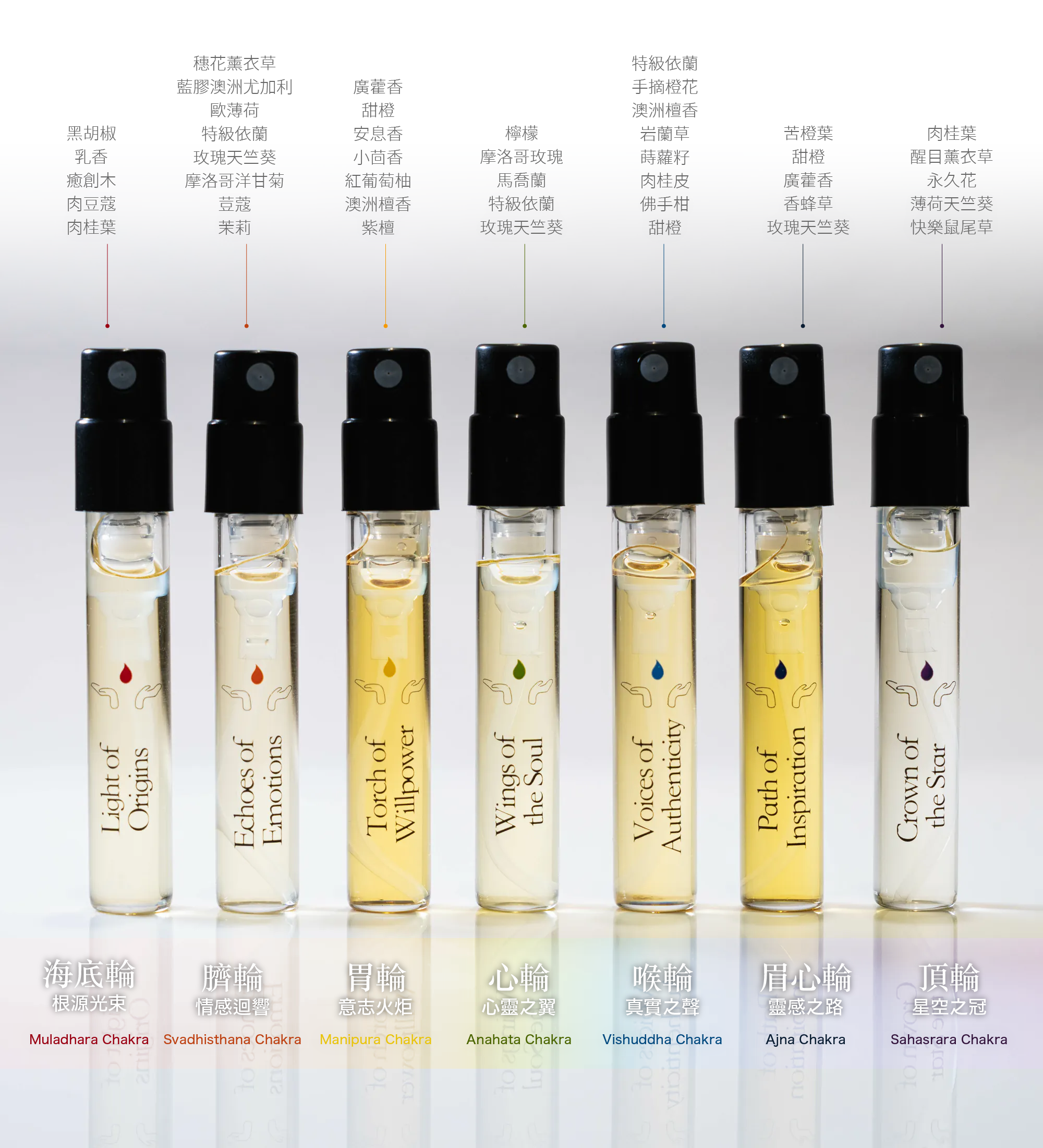 臍輪: 穗花薰衣草、藍膠澳洲尤加利、歐薄荷、特級依蘭、玫瑰天竺葵、摩洛哥洋甘菊、荳蔻、茉莉