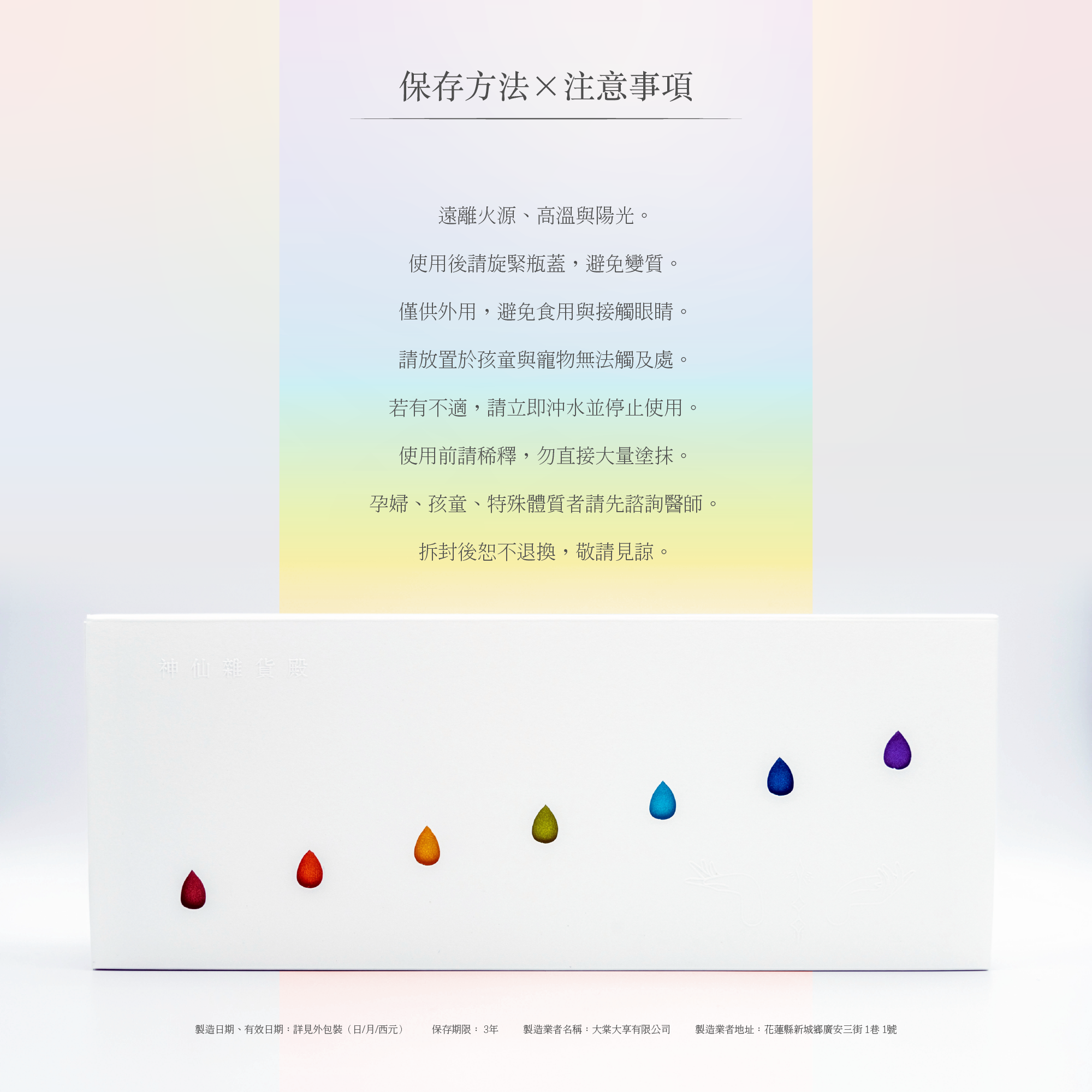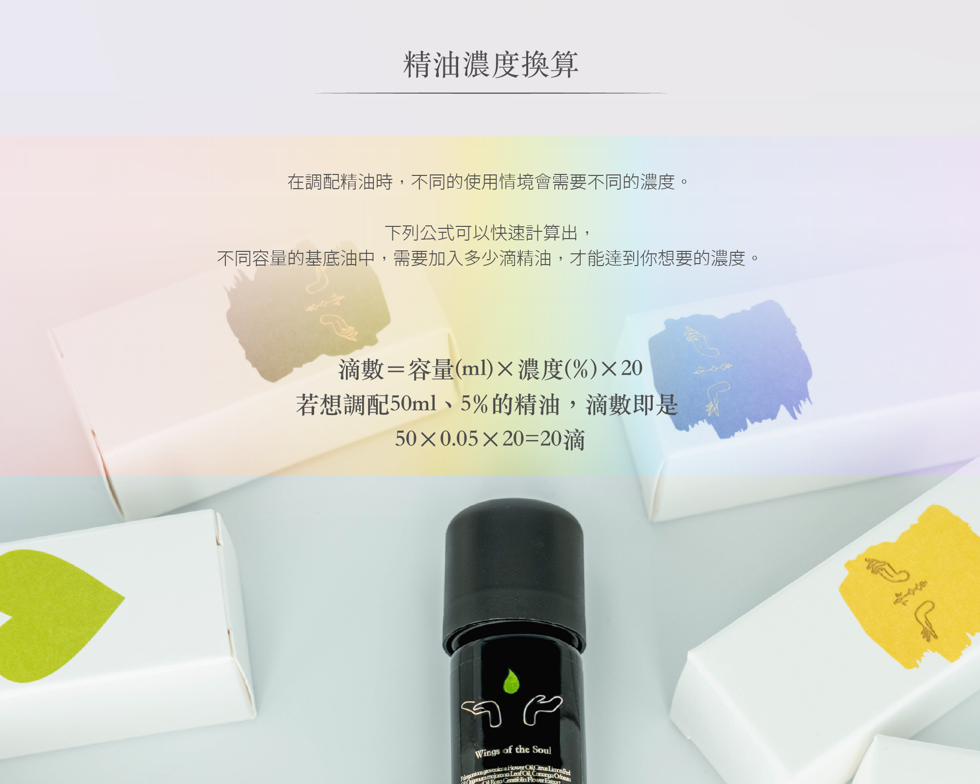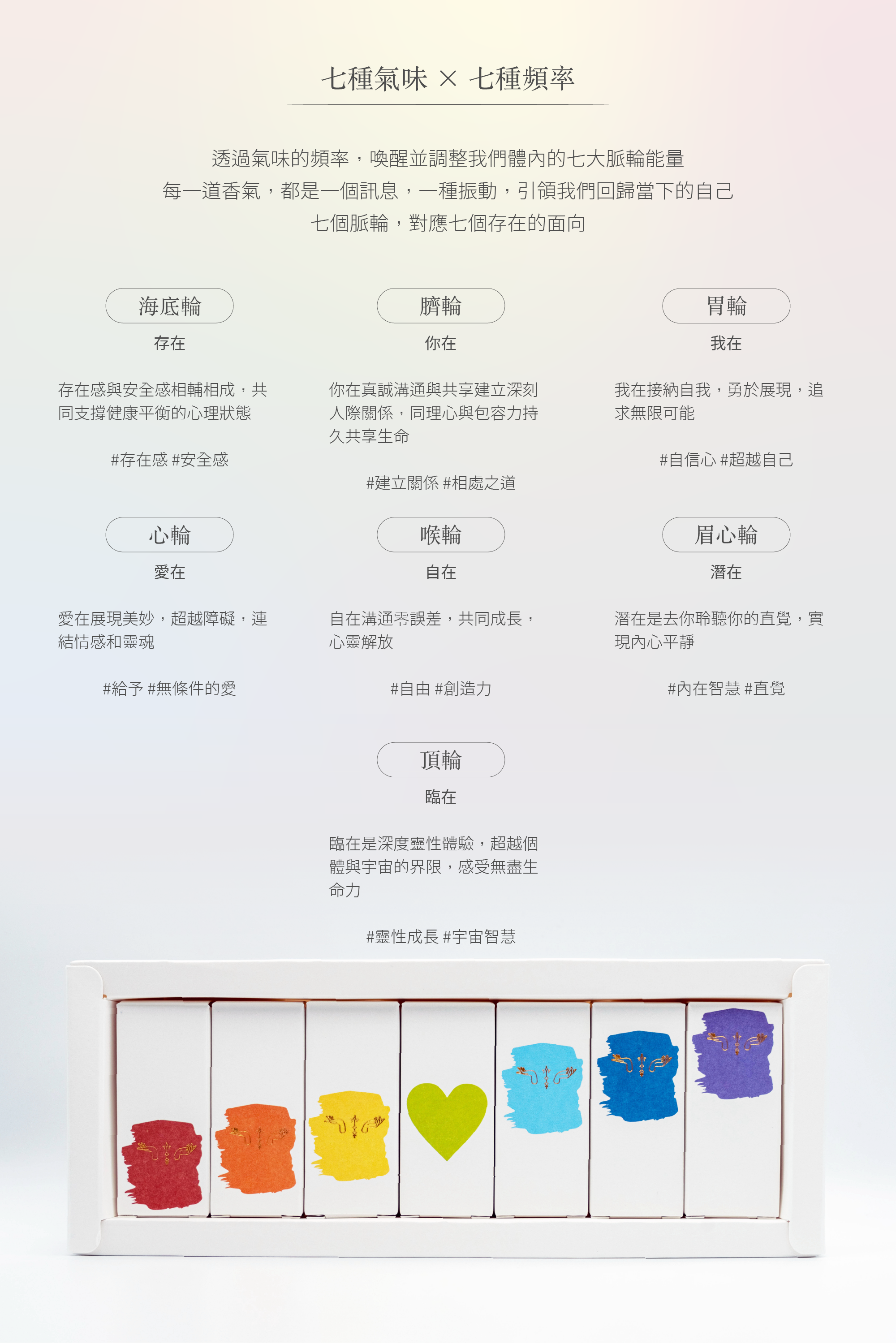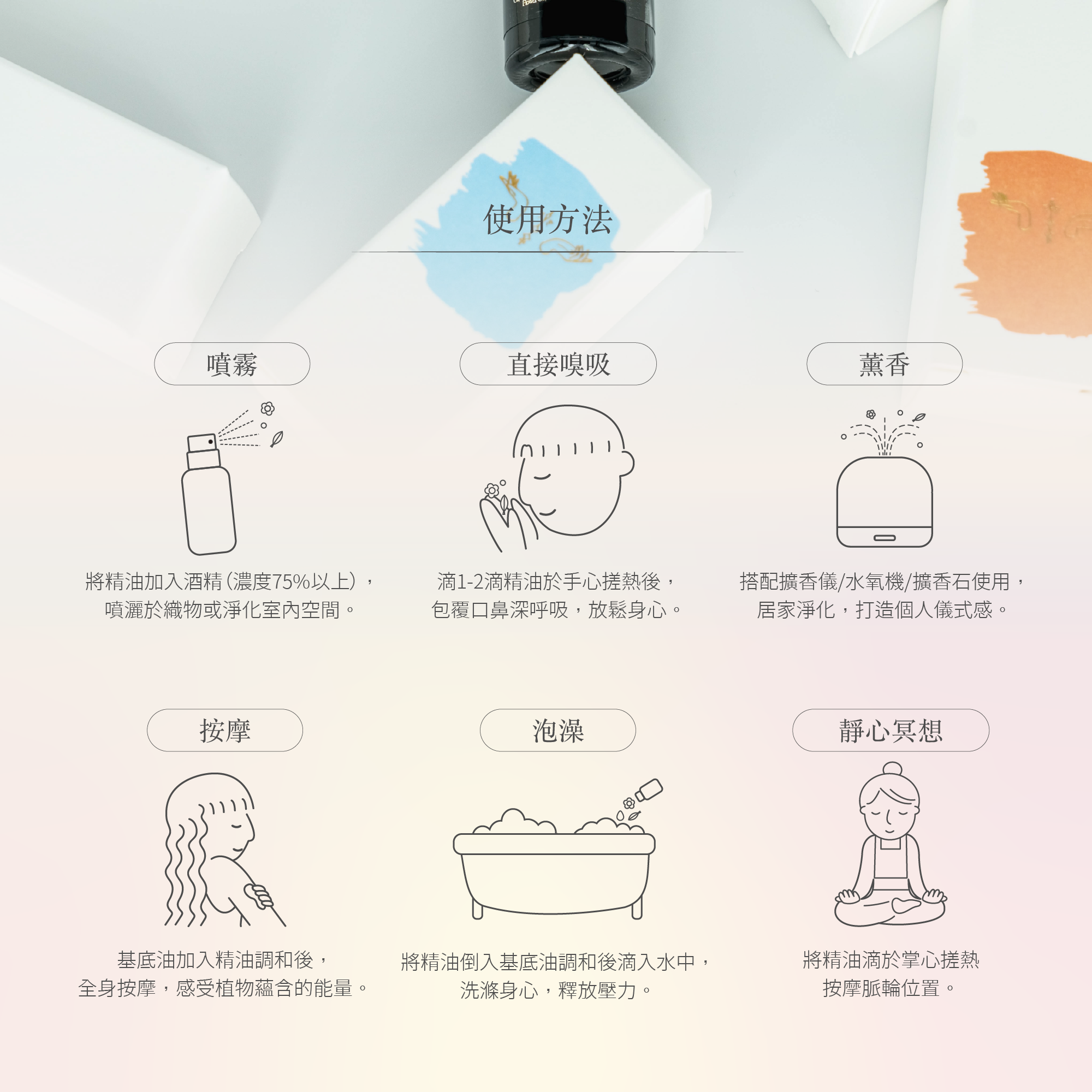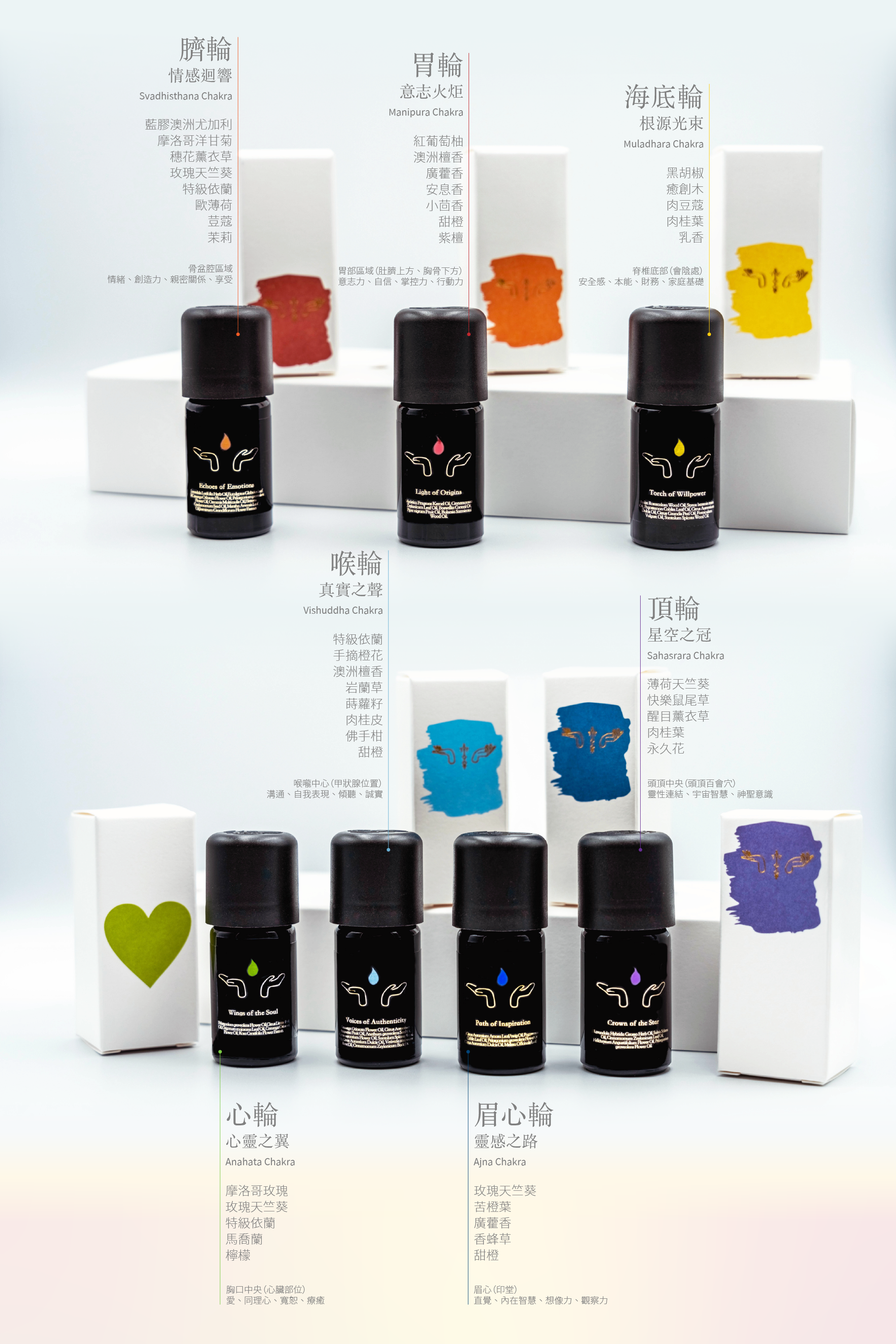 臍輪: 穗花薰衣草、藍膠澳洲尤加利、歐薄荷、特級依蘭、玫瑰天竺葵、摩洛哥洋甘菊、荳蔻、茉莉
